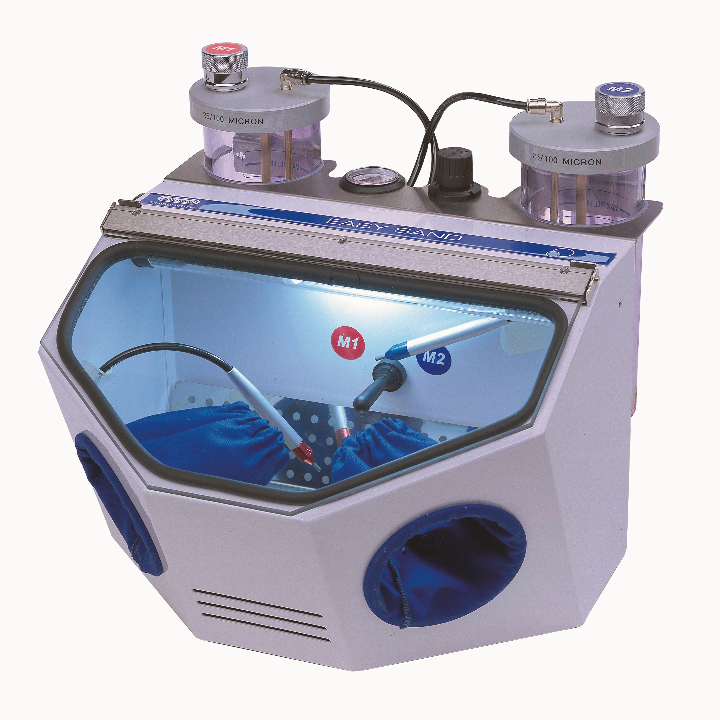 Sistema de arenado de doble módulo para limpieza y preparación de prótesis con gran precisión.